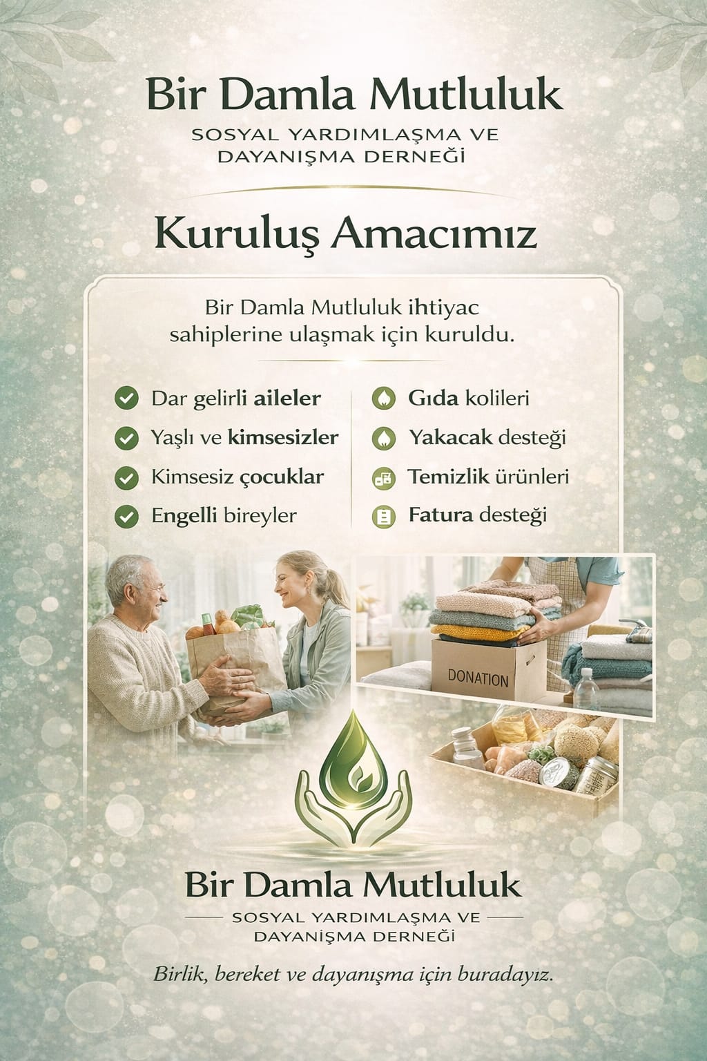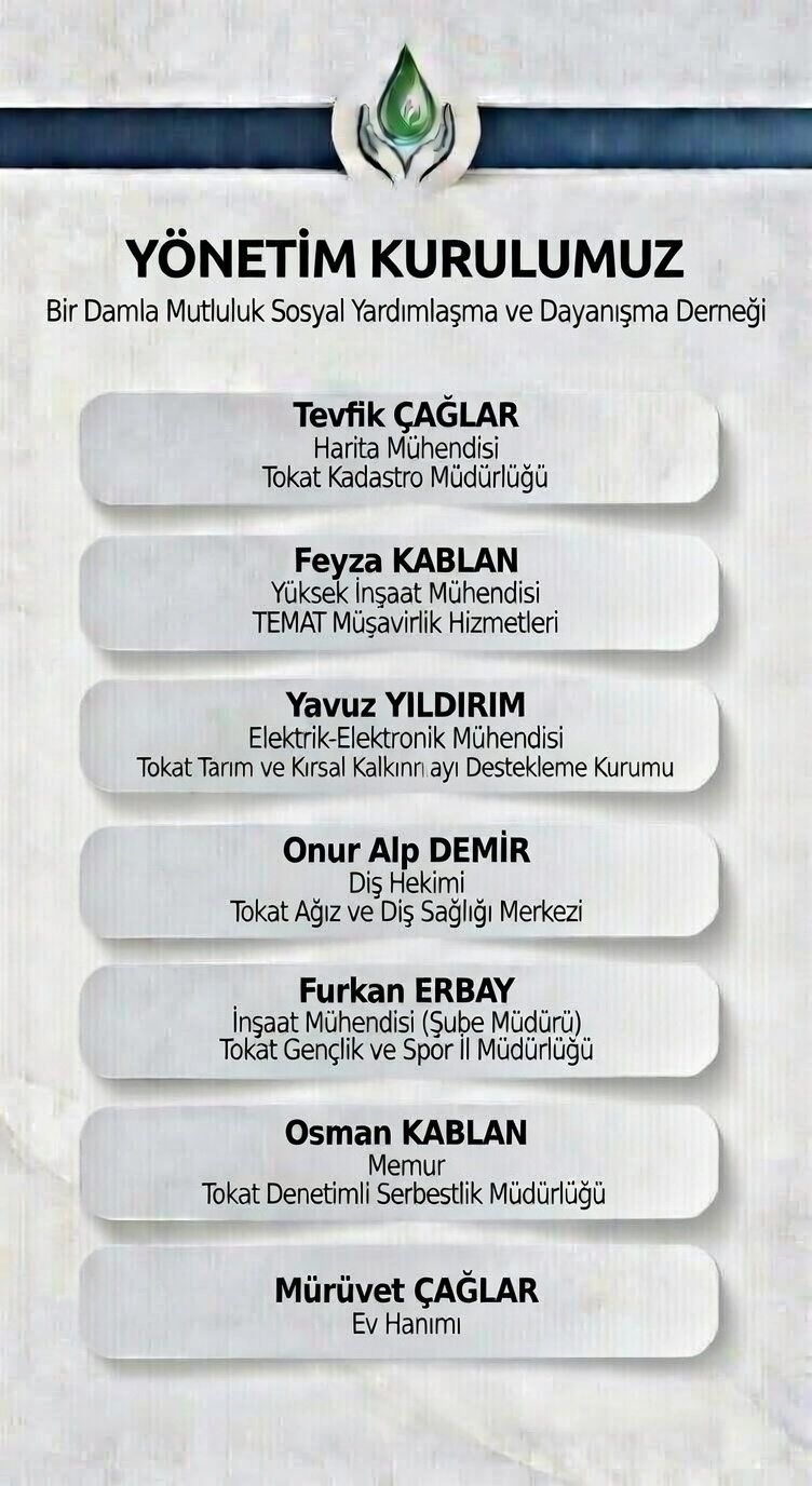 Bir Damla Mutluluk, ihtiyaç sahiplerine yardım eli uzatmak için kurulmuş bir insani yardım kuruluşudur. Tokat ve yakın çevresinde ihtiyaç değerlendirmesi yaparak, yardım taleplerine cevap veriyor ve erzak ve maddi yardımlarla onlara bir damla mutluluk veriyoruz.